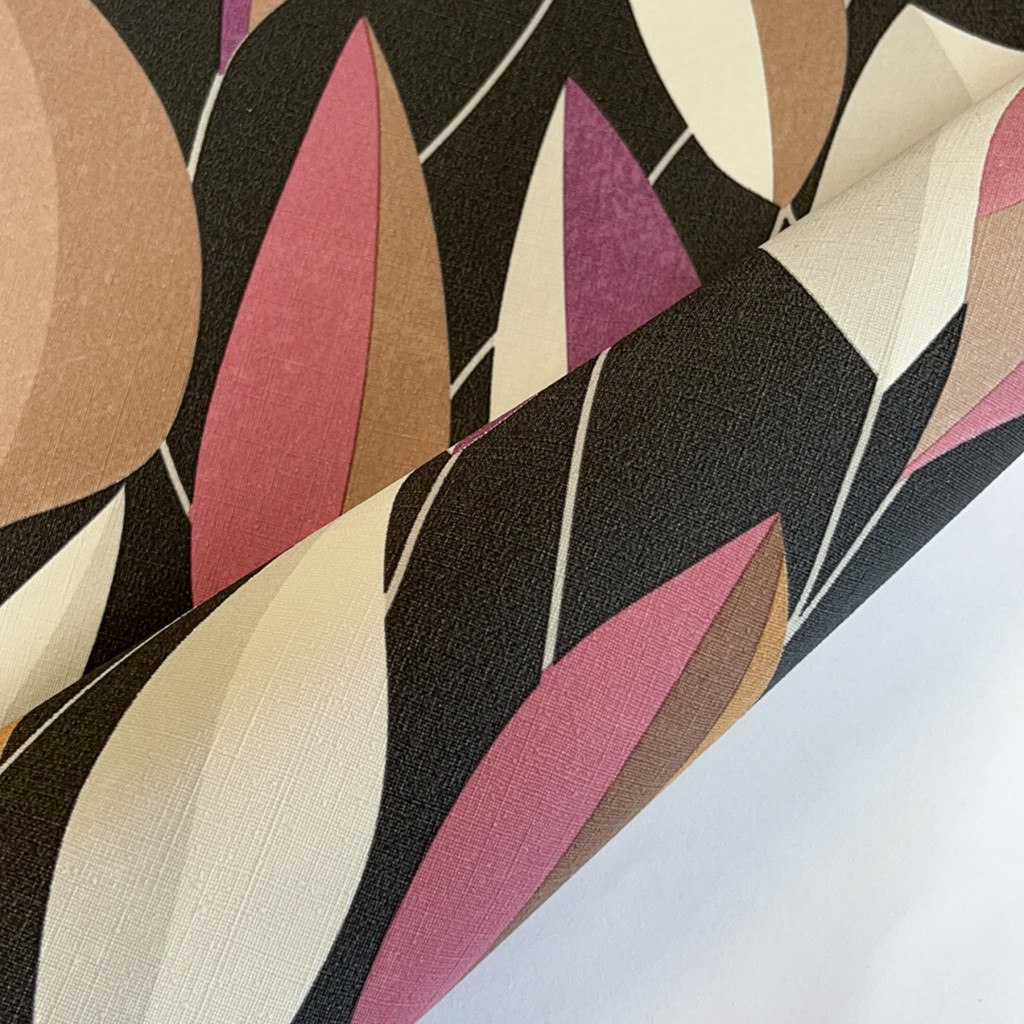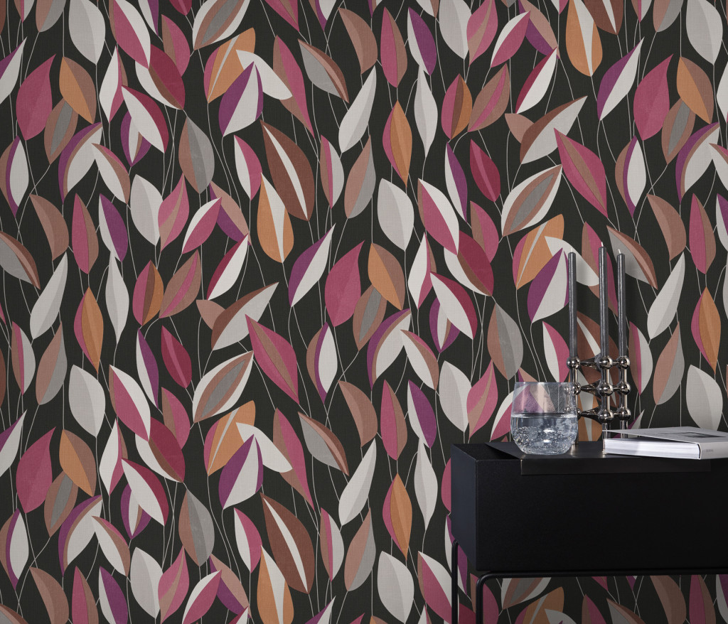 Fekete alapon rózsaszín, szürke és barna levélmintás Vlies tapéta, Gentle 10431-06