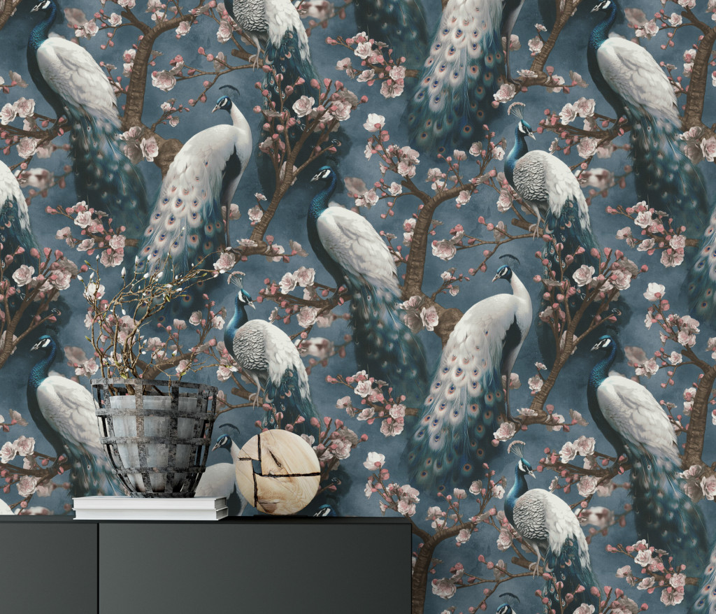 Kék színű páva mintás Vlies tapéta, Play of Light 10414-08