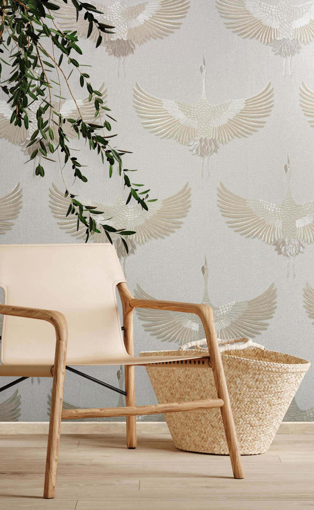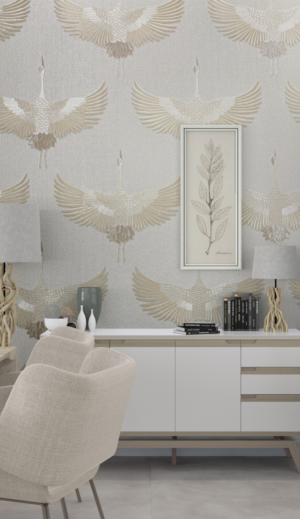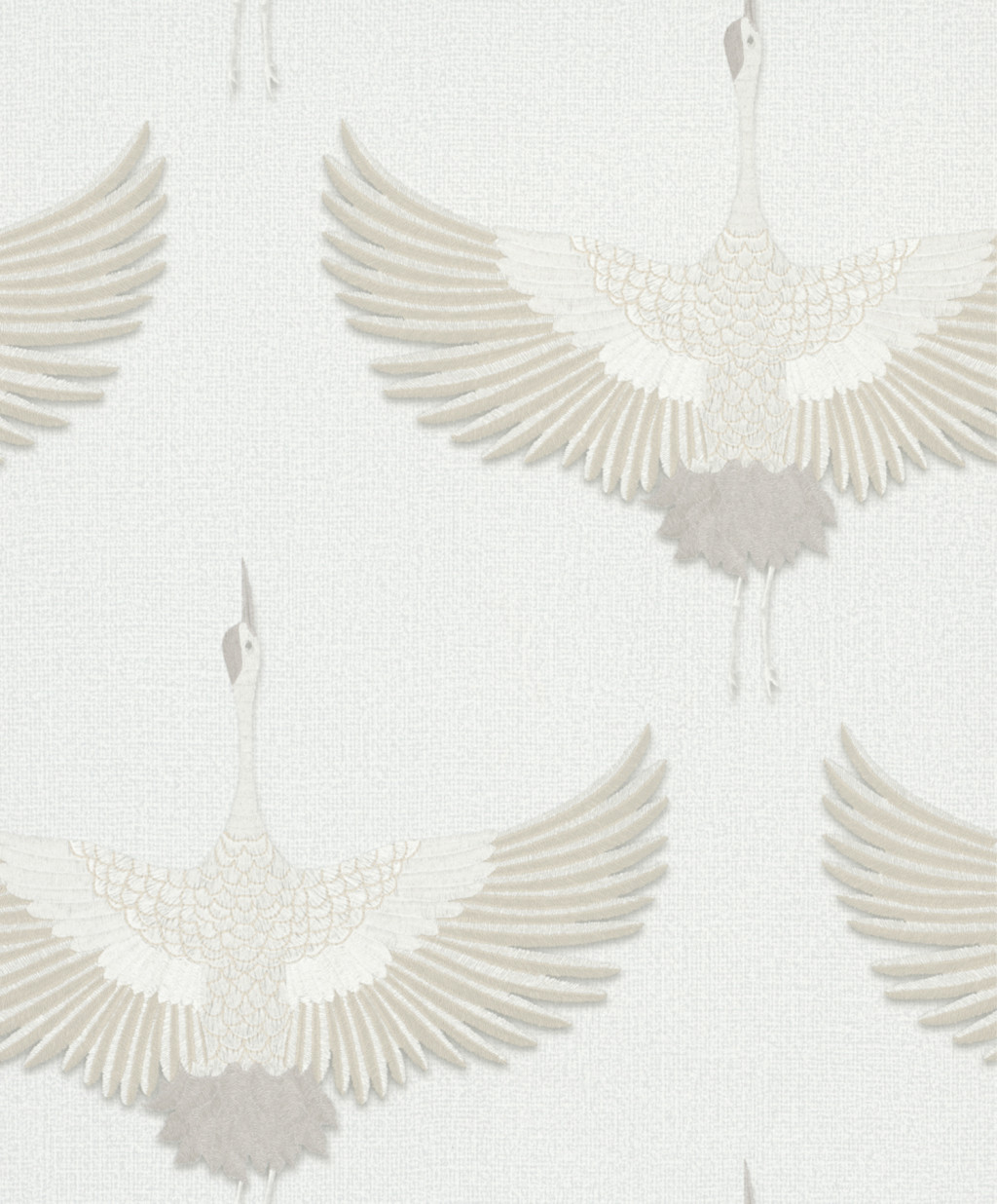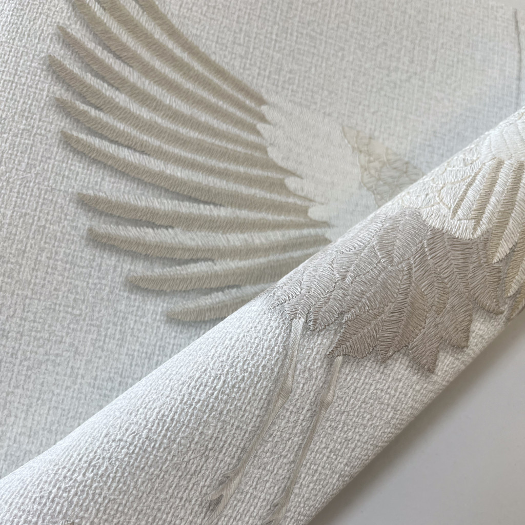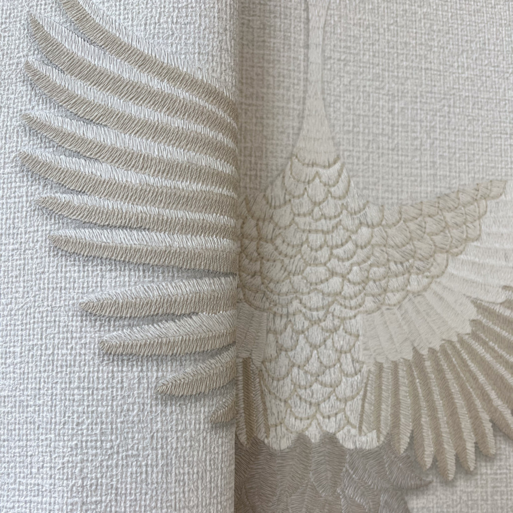 Tört fehér alapon bézs színű darumadár mintás Vlies tapéta, Kumano 1834529